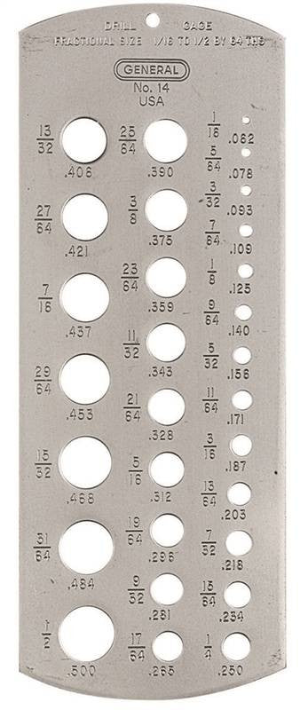 The hole sizes and decimal equivalents are permanently etched on face so they won't wear off with repeated use. Number size drills 61 to 80. Fractional size drills 1/16" to 1/2" x 64ths. Metric range from .062 to .500mm. This gage has been crafted to meet government specifications.