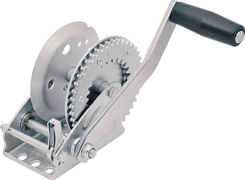 Two-way ratchet, 8' handle, 3/4" hub. 4:1:1 gear ratio. Includes comfort grip handle for a positive hold while cranking. Zinc-plated finish for superior corrosion resistance. Heavy-duty rib reinforced frames maintain proper gear alignment. Full-length drum bushing and oil impregnated shaft bushings minimize scheduled maintenance. High carbon SAE 1050 steel gears to resist wear and last longer. Mounting hardware sold separately. 1300 pound capacity.