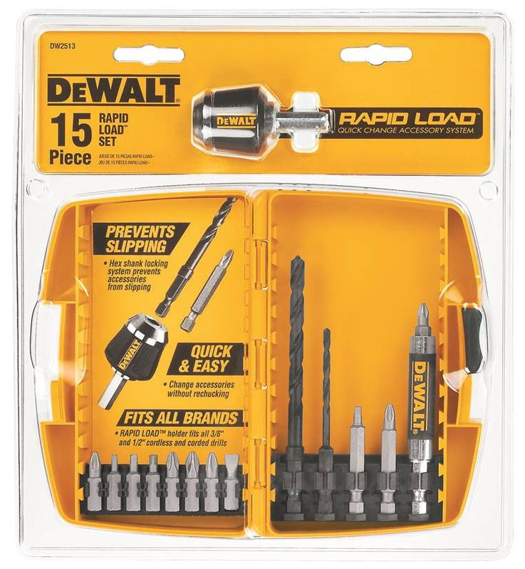 Quick and easy accessory changes allow users to finish jobs faster. Hex shank locking system prevents bits from slipping, rapid load holder fits all brands of corded/cordless 3/8" or 1/2" drills. Includes: rapid load holder, 1/8" and 1/4" hex shank drill bits, compact magnetic drive guide, #2 Phillips 2" power bit, #2 square recess 2" power bit, #1 and #2 Phillips 1" insert bits, #1 and #2 square recess 1" insert bits and #8 slotted 1" insert bit.