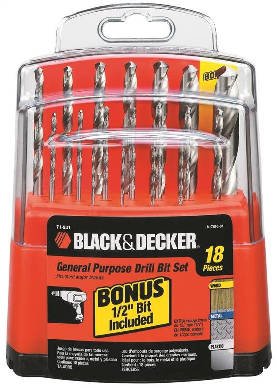 For drilling in wood, metal and plastic. Assorted sizes 1/16" to 1/4", with bonus 1/2" bit included. It is organized by a bit bar for storing in toolbox, pocket or kitchen drawer.
