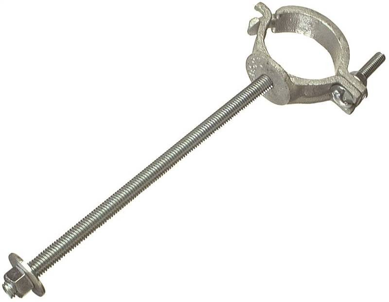 Malleable iron. Use to secure service entrance conduit to the surface of a building. With 10" bolt, nut and washer. Tray boxed.