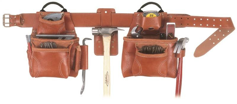 Easy carry handle design provides simple adjustments, carrying and storage of combo without spilling contents. 5 main reversed nail/tool pockets. 10 smaller pockets fit pliers, nail sets, pencils, knife, etc. Leather holder fits up to 30' measuring tape. Leather combination square and pry bar holders. 2-3/4" wide heavy leather belt with double tongue steel roller buckle. Extra-strength rivets with washers at key stress points. Fits waist sizes 47"-55".