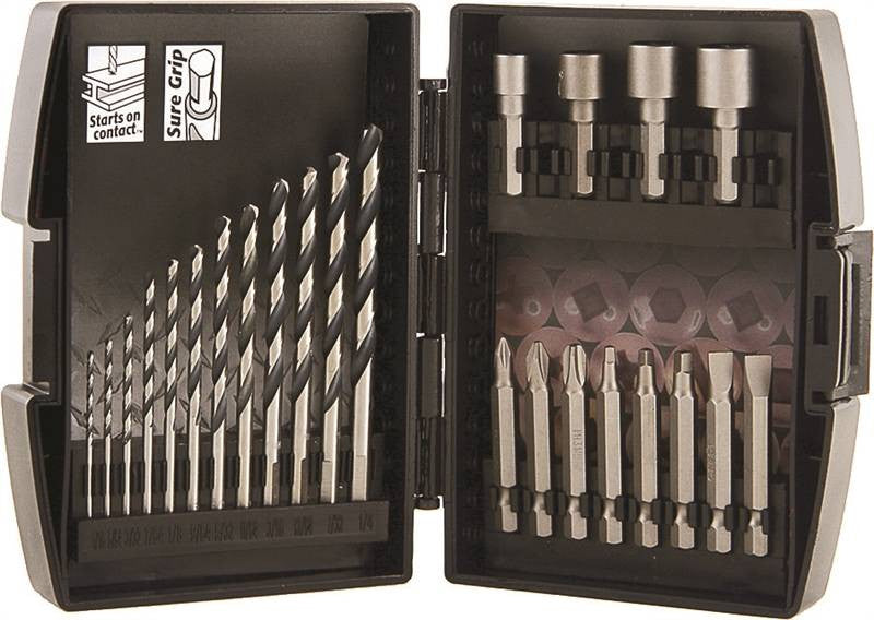 Power drill and driver set which includes 12 piece drill set, 8 piece insert bit and 4 piece nutsetter; for a variety of drill and driving applications in your home, shop or jobsite. Includes (1) one each: HSS drills: 1/16", 5/64", 3/32", 7/64", 1/8", 9/64", 5/32", 11/64", 3/16", 13/64", 7/32", 1/4", screwdriver bits: Phillips #1, #2, #3 , square recess: #1, #2, #3, 6-8, 8-10 slot, nutsetters: 1/4", 5/16", 3/8", 7/16" and plastic case with rubberized grip panels.
