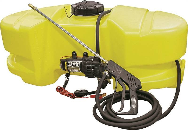 Ideal for applying insecticides and herbicides. Dependable High-Flo pump with 2.1 GPM, 60 PSI, 7 amp draw. Rugged pistol grip handgun for good solid performance. Applies spray right where user wants it. 96" lead wire with quick coupler, in-line switch and deluxe battery clips allow operator to use sprayer immediately without hunting for wire and patching it to the power source. Includes: 15' of hose, handgun with adjustable tip, 25-gallon low-profile polyethylene tank with molded in recesses on tank ends for handles and/or hose storage. Tank has a 5" screw-on cap for easy filling, molded in gallon markers to view tank contents and molded in inserts on the bottom, which can be used to mount the tank in a variety of applications. Sprayer includes: 12-volt diaphragm pump that draws seven amps.