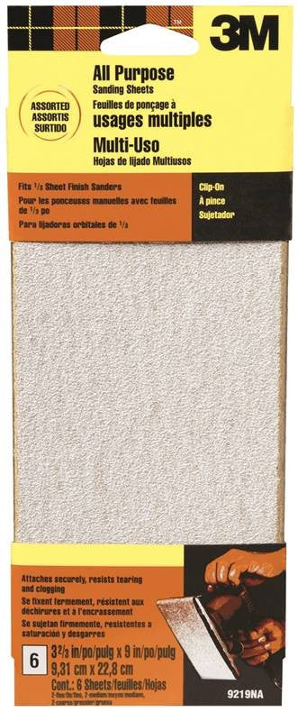 Made with tough, long-lasting aluminum oxide mineral abrasive. Assorted grit includes (2 )each: fine, medium, and coarse. Fits: All 1/3 Sheet Sanders. Applications: Wood, Metal, Plastic, & Painted Surfaces.