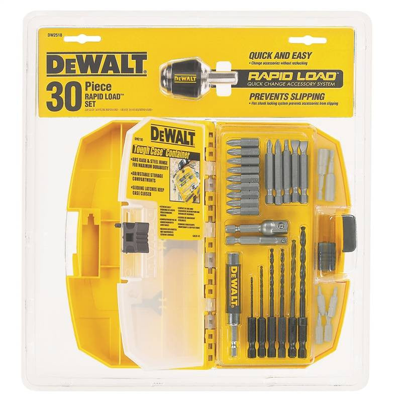 Hex shank locking system prevents bits from slipping, rapid load holder fits all brands of corded/cordless 3/8" or 1/2" drills. Includes: rapid load holder, (1) one each: 1/4" and 3/8" socket adapters, 1/16", 3/32", 5/32" and 3/16" hex shank drill bits, #1 and #2 Phillips 2" power bit, #8 and #10 slotted 2" power bit, #1 Phillips 1" insert bit, #1 and #2 square recess 1" bit tip, #2 square recess 2" power bit, #8 slotted 1" insert bit tip. (2) each: 1/8" hex shank drill bits and (9) nine each: #2 Phillips 1" insert bit tips.