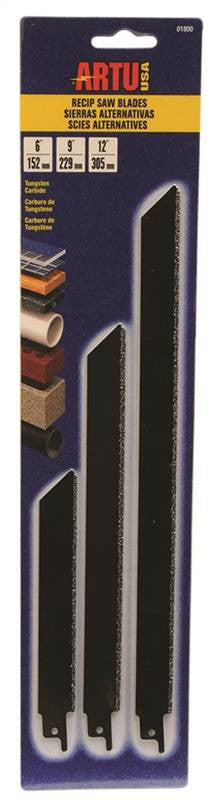 Gritted blade fits all reciprocating saws. Resistant to heat and abrasion, never needs resharpening. Applications: Cuts Brick, Cast Iron Pipe, Ceramic Tile, Composites, Fiberglass, Flagstone/Slate, Hardwood, Laminates, Marble, Plaster, Plywood, PVC, Reinforced Cement. Set Includes 1 Each: medium grit, 3/4" Wide: No.1810, 6", 152mm, No.01818, 9", 229 mm, No.1822, 12" 305mm.