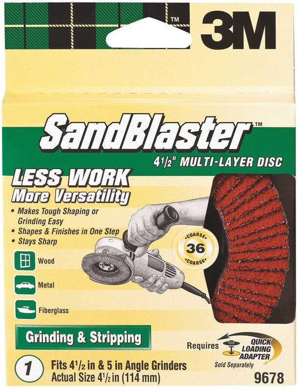 For use on wood, metal and fiberglass, shapes and finishes in one step, fresh abrasive is exposed with use, ensuring a sharp cut every time, 4" fits 4" angle grinder; 4-1/2-" fits either 4-1/2" or 5" angle grinder, must be used with Quick Loading Adapter 9675 (287.2901).