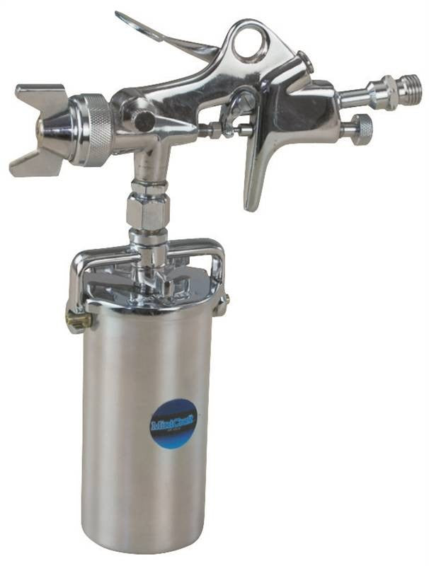 Standard nozzle: 0.063 inch/1.6 mm. Air pressure: 40-50 PSI. Air consumption at 40 PSI: 4.5 CFM. Canister: 6.8 fluid oz. (200CC). Air inlet: 1/4" NPT. Required air hose size: 3/8". Pattern control adjustment knob. Stainless steel components.