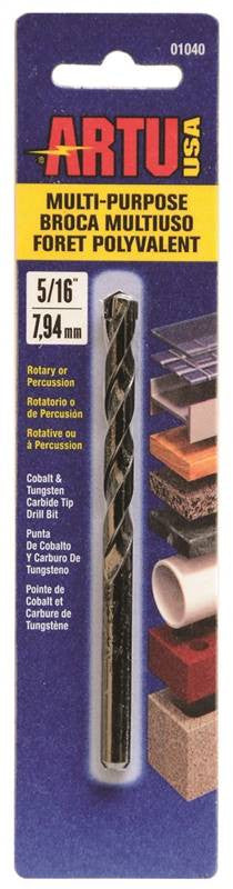 For rotary or percussion drilling. Chrome vanadium steel shank with tungsten carbide/cobalt tip that is resharpenable, and able to withstand drilling temperatures up to 2,000 degrees Fahrenheit; no center punch needed. Use with cordless drills, corded drills and drill presses in applications such as masonry, ceramic tile, concrete, brick, fiberglass, plexiglass, glass, cast metals, hardened steel, granite, marble, woods, plastics. Not recommended for use on mild steel. This includes aluminum, angle iron, copper, galvanized pipe, brass and stainless steel.