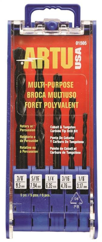 For rotary or percussion drilling. Chrome vanadium steel shank, diamond ground tip, special negative back grinding enables tip to bore through brick, concrete, masonry, ceramic tile, fiberglass, plexiglass, glass, cast metals, hardened steel, granite, marble, woods, and plastic with a filing action. High tech bonding allows bit to withstand drilling temperatures up to 2,000 degrees Fahrenheit. Easy to resharpen. Includes (one each): 1/8", 3/16", 1/4", 5/16" and 3/8" and plastic case. NOTE: Not recommended for use on mild steel. This includes aluminum, angle iron, copper, galvanized pipe, brass and stainless steel. Packaged in a plastic case.