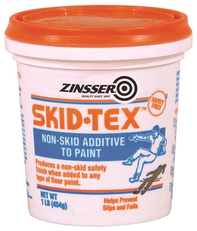 An exclusive, non-skid compound, specially-formulated for easy mixing and application in all types of floor paints. Gives a durable non-skid safety coating to all types of interior and exterior surfaces. Applies with a paint roller or brush as easy as if applying regular paint. Helps prevent slips and falls. For use with washrooms, floors, patios, marine use, pool decks, stairways, ramps, ladders, and walkways. SKID TEX will not change the color or the performance properties of the paint. One pound is needed per gallon of paint.