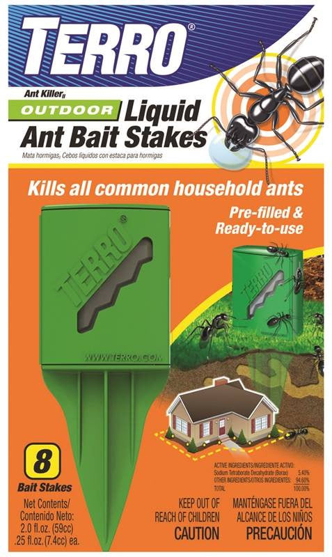 See-thru bait monitor so you know when to replace the stake. Tiered stairs for easy access to bait. Reinforced stake ridges for added strength when put in the ground. Attracts and kills all common household ants including Argentine, ghost, little black, acrobat, pavement, odorous house, crazy, cornfield and other sweet eating ants. Easy to open; simply break off bait pack tab. The stakes are specifically formulated to allow worker ants to consume the bait and survive long enough to carry the liquid back to the next and deliver a dose to the rest of the colony. The liquid bait inside the stake offers ants both a food and water source. Outdoor liquid ant bait stakes feature eight filled stakes per box.
