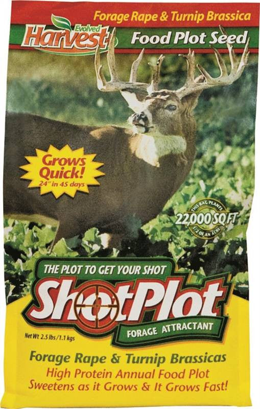 Forage attractant grows 24'' in 24 days. Contains forage rape and turnip brassicas. High protein annual food sweetens as it grows. 2.5 lb. bag covers 22,000 square ft. or 1/2 acre. Can be planted in spring and fall.