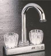 4" centers. Bar style spout, dual acrylic round handles, ABS construction, plastic waterways, washerless cartridge, 1/2" 14NPSM inlet. IAMPO & NSF certified. Carded.