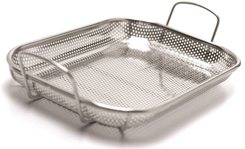 The rectangular 14" x 10.25" stainless roasting basket features micro perforations that create a smooth and even roasting surface. Easy to clean and ideal to cook on. The tiny holes allow fewer small pieces to fall through into the grill.