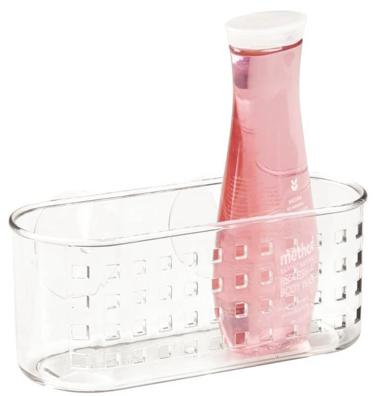 Provides easy access to your soaps, lotions and sponges. Made of clear plastic with textured bottom and a ventilated design, this caddy drains all the water from shower accessories, keeping them clean and dry. Easy installation with no assembly required. Drainage holes on bottom allow accessories to stay dry and clean. 4.3 x 10.2 x 5.2 In.