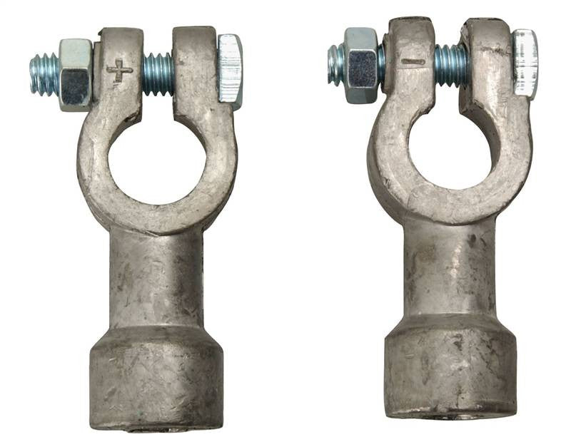 Converts top post terminal battery to a side terminal battery. Marked "+" and "-" for easy identification. Works with battery cables 6 through 1 gauge. 6 and 12 volt only. Package contains one positive and one negative adapter.