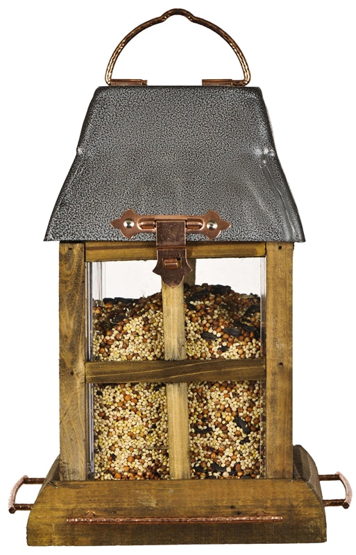 Crafted of durable Fir. Rustic copper colored accents. U-Shaped perches so birds can feed from all sides.