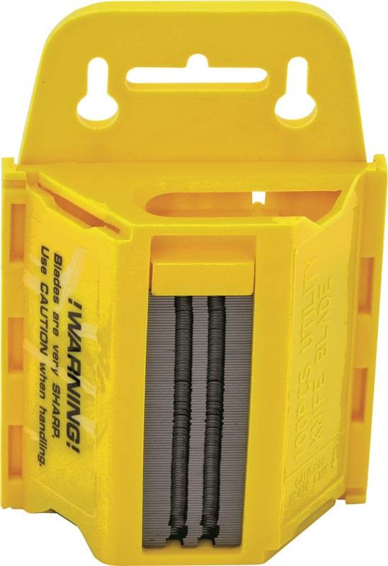 Contractor grade SK2 steel blade, 0.24"-0.6mm, thick. For use with utility knives, trimmers, and scrapers. Includes safe blade dispenser and 100 blades.