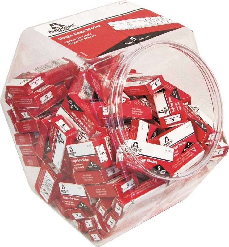 Display contains: 100 UPC-coded tucks of 5's per sealed, reshippable tub. 0.009" high-carbon surgical steel, Single Edge blades each protected in shelling paper.