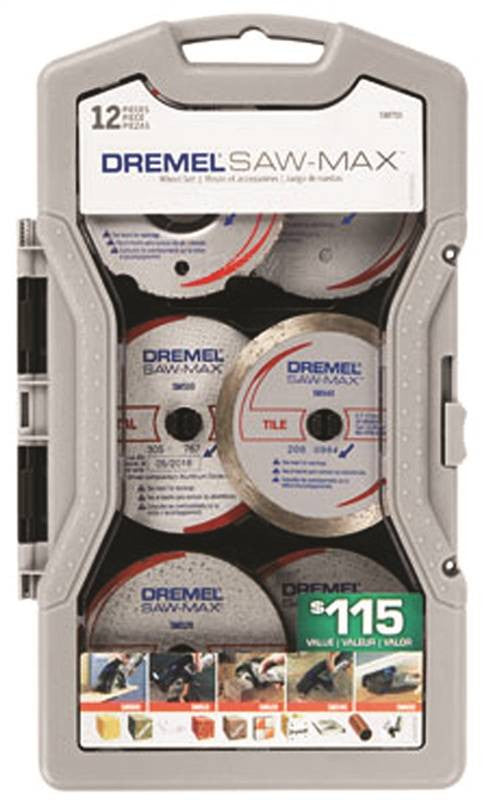 Contains 12 genuine Dremel Saw-Max cutting wheels. Gives you all of the accessories needed for making simple cuts through a wide range of materials. Allows the user to cut through wood, plastic, drywall, laminates, metals, brick, tile and more. Set includes: (1) SM600 wood and plastic flush-cut wheel, (2) SM500 wood and plastic cutting wheels, (1) SM540 tile diamond wheel, (2) SM520 masonry cut-off wheels and (6) SM510 metal cut-off wheels. Includes reusable storage case.