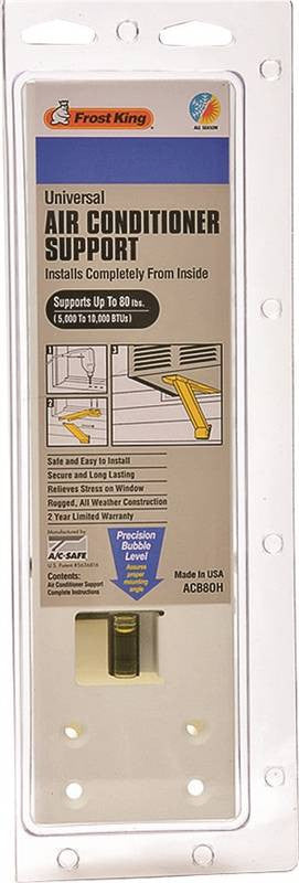 Universal air conditioner metal support bracket installs completely from inside. Safe and easy to install. Secure and long lasting. Relieves stress on window. Rugged, all weather construction. Precision bubble level assures proper mounting angle.