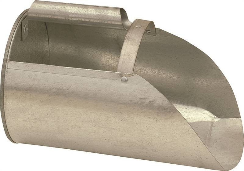 An all-purpose 4 quart scoop. Durable galvanized steel. Flat bottom slides easily into corner. Holds approximately 3.5 lbs. of feed. 11-1/4" L x 6-3/4" dia. Weight: 8 lbs.