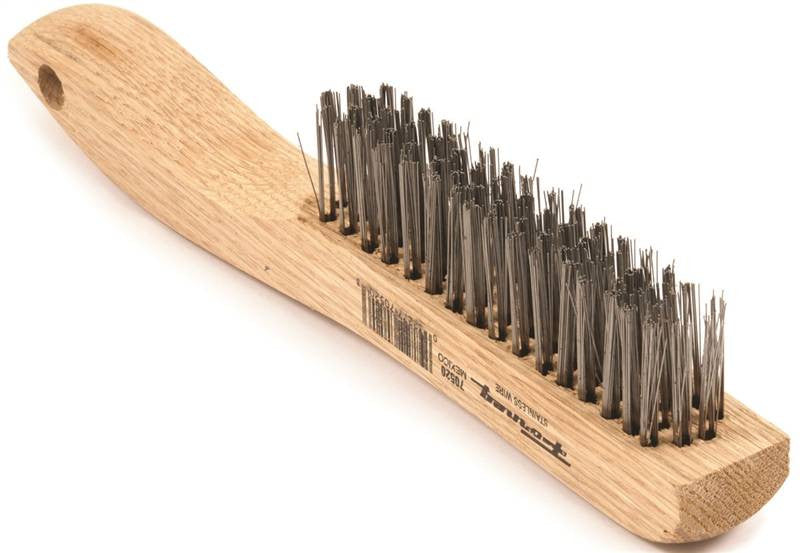 Strong and durable with solidly imbedded stainless steel (SS) bristles. Long curved wood handle with pre-drilled hang hole. Excellent for general purpose cleaning of cook-out grills, in dairy operations, restaurants and surfaces exposed to high humidity. Angled head design eliminates cut and bruised knuckles. Features .006" (.15mm) diameter.