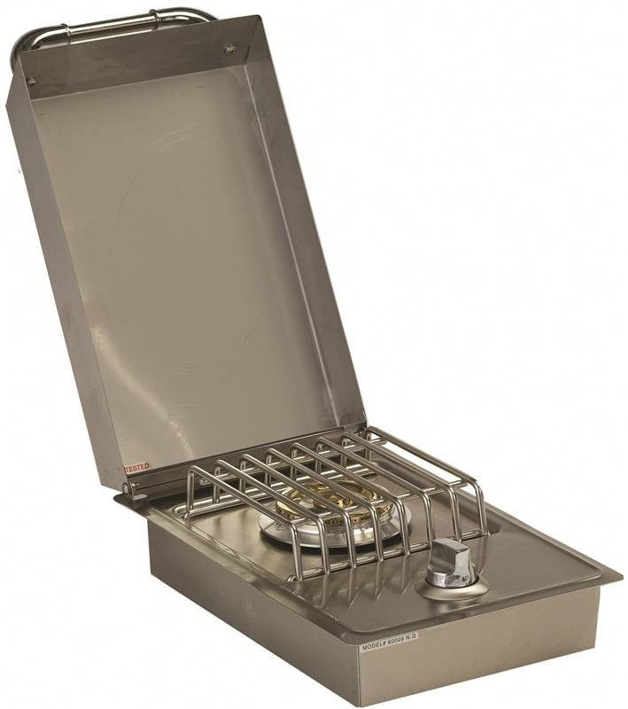 304 grade 16 gauge stainless steel construction. 15,000 BTU's. Cast brass burner. Solid stainless steel grate. Drop-in design. Piezo ignition.