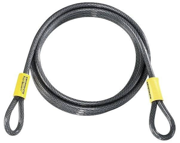 Braided steel vinyl coated cable with extra long oversized swages. Double loop design allows cinching for more usable length and more flexible lock-up options with Kryptonite padlock or any padlock. 3/8" diameter cable.