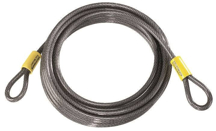 Braided steel vinyl coated cable with extra long oversized swages. Double loop design allows cinching for more usable length and more flexible lock-up options with Kryptonite padlock or any padlock. 3/8" diameter cable.