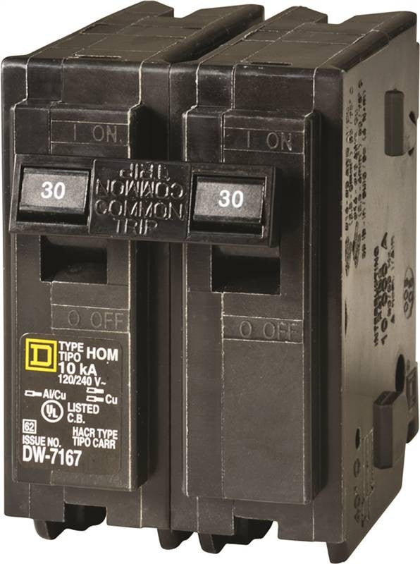Double pole 2" circuit breaker features 10,000 AIR and 120/240 VAC. Thermal-magnetic tripping mechanism for overload and short-circuit protection of electrical system. Accepts aluminum or copper conductors. CSA approved to only install in Canadian HomeLine loadcentres.