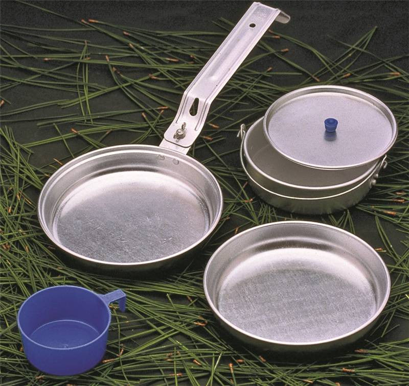 Kit contains 7'' fry pan with detachable handle, 6-1/2'' frypan cover/plate, 1/2 quart boiling pot with lid and 8 ounce plastic cup. All pieces nest together compactly.