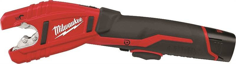 Close quarter rotating cutting head cuts pipe in confined spaces, automatic adjustment from 3/8"-1" tubing, auto locking mechanism delivers up to 200 cuts per charge, water resistant sealed metal cutter head, battery fuel gauge displays remaining run-time, built-in LED light illuminates line of cut. Specs: 12V, 500 RPM, trigger set: cut/reset to open, copper cutting wheel, capacity 1/2" to 1-1/8" O.D., 14" long, weighs 3.2 lbs. Includes: (1) 12V Red Lithium battery, (1) 30 minute charger, (1) carrying case.