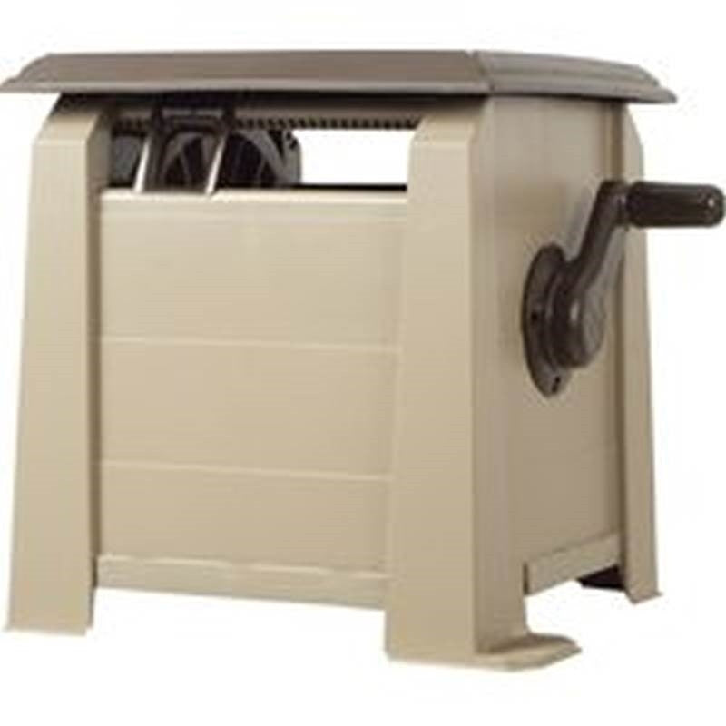 Multi-functional unit conceals hose and can be used as a bench or table with a 250lb. capacity. All poly unit does not rust or corrode. Lid lifts up to provide easy access to hose. Hidden handle folds in for safety and overall appearance. Handle grip rotates to prevent "burn" when winding hose. Snap down foot rest folds down for use. Double o-ring water system with 90 degree elbow to prevent leaks and drips, and leader hose kinking. Water system outlet located inside basket for easy attachment of hose. 5' leader hose included. Holds 175' of 5/8" hose.