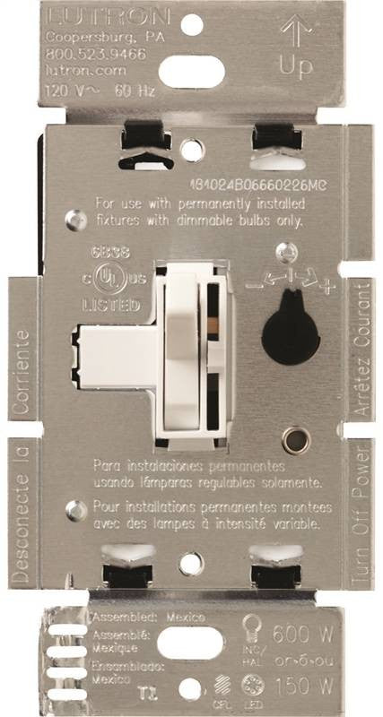 Toggle switch turns lights on/off and returns light to preset level. Use slider to select desired brightness level. Utilizes HED Technology, which features advanced dimming circuitry that is designed for compatibility with most dimmable CFL and LED bulbs. Wallplate not included. Up to 150W dimmable CFL/LED bulbs or 600W incandescent/halogen.