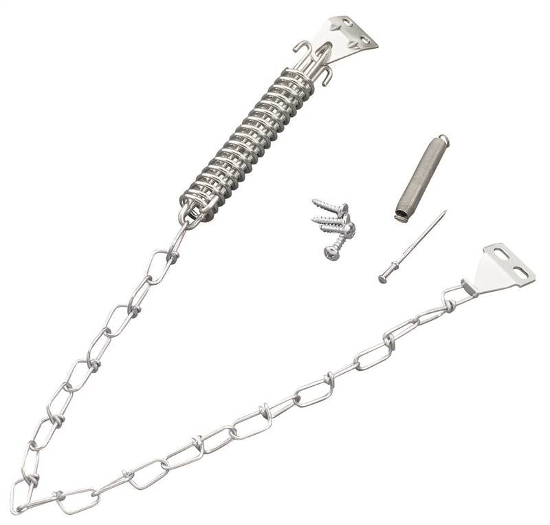 Protects door and closer from wind damage. Includes wind chain and hold-up spring to prevent chain from hitting door and scratching glass. Mounting brackets and screws also included.