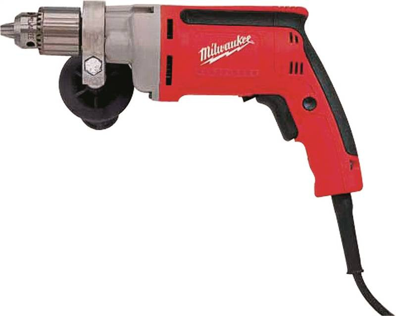 Features an all metal gear case and diaphragm, heavy-duty chuck, 360-degree locking side handle, ergonomic textured grip and two finger trigger for user comfort and balance. Specs: 120V AC, 0-850 rpm no load speed, drilling capacity in: wood (auger bit)- 1-1/2", wood (self-feed bit)- 2-9/16", metal (hole saw)- 2", 1/2in-20 spindle, double gear train, 8 ft. fixed 3-wire rubber cord, soft grip handle and weighs 5.4 lb. Includes side handle and chuck key with holder.