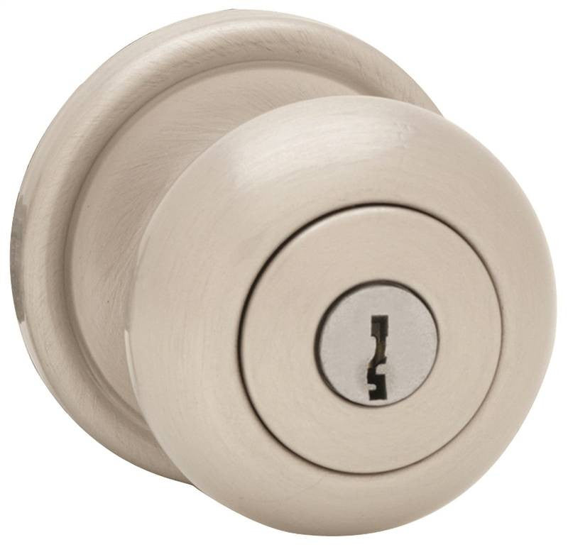 For keyed exterior doors. Both knobs lock or unlock by key outside or turnbutton inside. DOOR PREP: 2-1/8" Cross Bore, 1" Edge Bore, 1" x 2-1/4" Latch Face. BACKSET: 2-3/8" - 2-3/4" adjustable. DOOR THICKNESS: 1-3/4" doors standard and 2-1/4" doors optional. CYLINDER: 5-pin SMT optional. FACEPLATES: 1" x 2-1/4" round corner. STRIKE: 2-1/4" full lip. BOLT: 1" throw. Nickel plated. HANDING: Reversible for right or left hand doors. ANSI/BHMA: Grade 2. Locksets with "SmartKey" (denoted SMT) feature allows, in 3 steps, locks to be re-keyed to a spare set of keys. When the spare keys are done being used, the lock can be re-keyed back to the original set of keys; can continually be re-keyed.