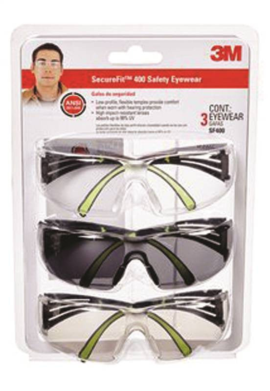 Features clear, gray and mirror 3-pack; adjustable nose pads and soft-touch inlays increase comfort and provide grip; lightweight design; scratch-resistant, anti-fog lenses; excellent coverage and good field of vision; meets requirements of ANSI Z87.1.