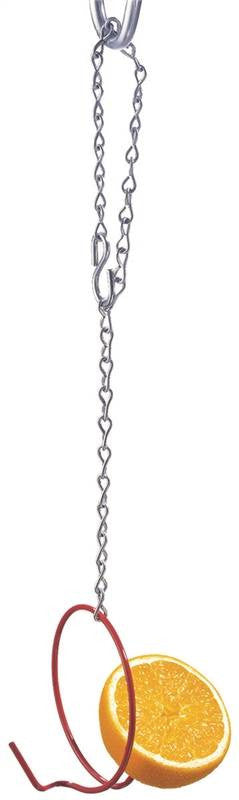 The fruit feeder is a fun and easy way to offer a sweet treat to your Orioles and other visitors. The orange powder coated metal wire holds two pieces of fruit tightly through their center, leaving the fruid totally open for bird enjoyment. This feeder is dishwasher safe and is held securely in place via a rust resistant chain with hook.