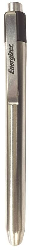 Aluminum silver body, push button tail switch for one handed operation and a sturdy clip. One super bright lifetime LED, 6 lumens and over 100 hours run time with 2 AAA alkaline batteries, included. Typical weight is 1.5 oz. with batteries. 5.720" x 0.659".
