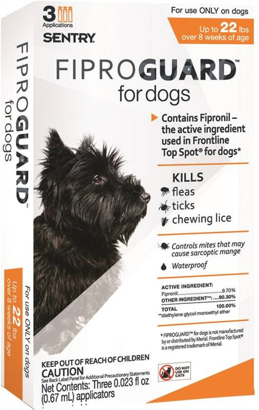 Topical flea and tick squeeze-on provides three-way protection that kills fleas, ticks and chewing lice. It kills deer ticks that transmit Lyme disease as well as brown dog ticks, American dog ticks and lone star ticks. It also controls mites that may cause sarcoptic mange. Waterproof. Can be used on breeding, pregnant and lactating dogs. Box contains 3 tubes of fast acting and long lasting, sustained release formula, which protects for up to 30 days. Contains the active ingredients: Fipronil.