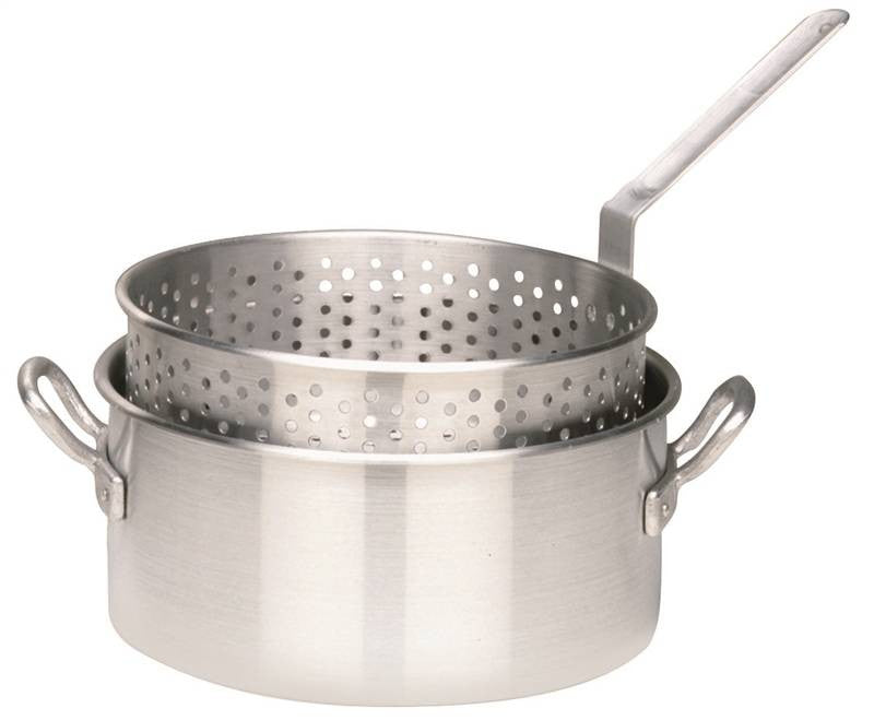 10-Qt Aluminum Fry Pot. riveted Handles. Perforated Basket with Cool Touch Handle. Use with basket to fry fish, shrimp, chicken, hushpuppies and fries. Use without basket for soups, stews and chili.