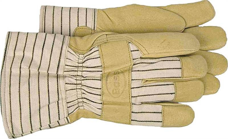 Grain pigskin leather palm, fully lined, leather index finger, leather finger tips, leather knuckle strap and pull, striped cotton back, continuous thumb, gunn-cut design, safety cuff, shirred elastic back.