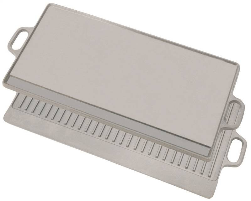 Reversible Cast Iron Griddle. 28-in length x 14-in width. Flat griddle and ribbed steak griddle. Seasoned. Sell with double burner cooker sku (6603740).