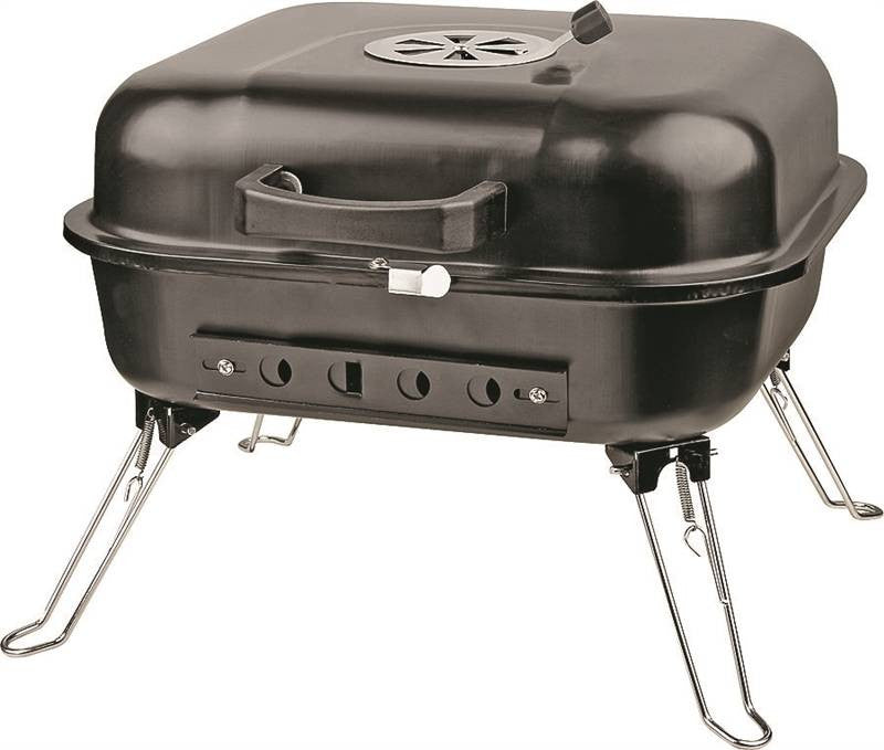 Long life porcelain enamel cooking grid. Hinged lid lock for portability. Convenient foldable legs for easier storage. Top and front vents for precise temperature control. 217 square inches of cooking surface. Overall size: 16-1/2''W x 17-1/2''D x 13-1/2''H.