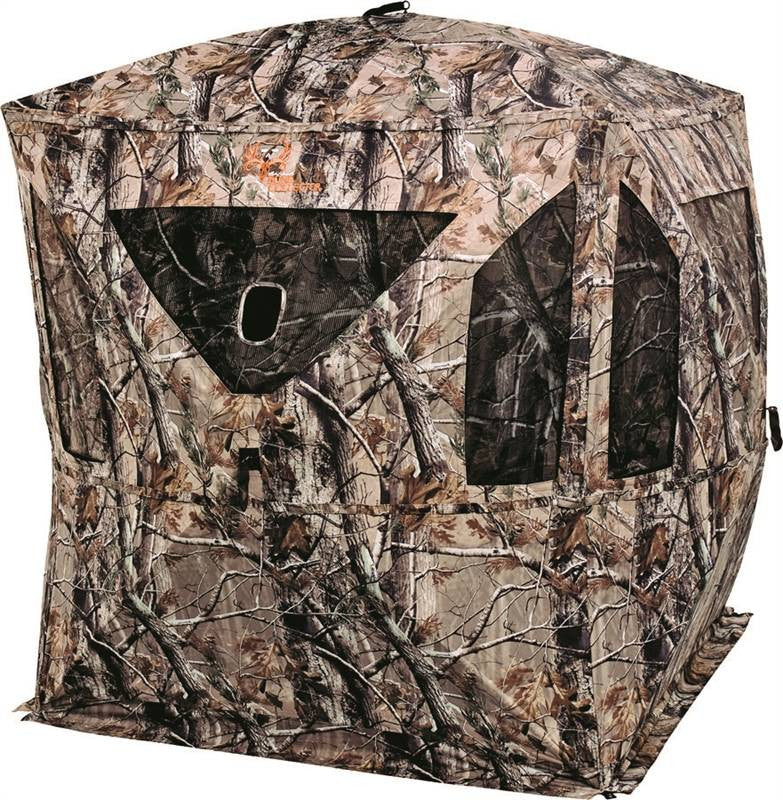 Features vertical window technology and a heat release roof vent system and shoot through mesh with gun port. Carbon enhanced fabric helps eliminate scent, shine and excess noise. Rugged hub style construction. Stakes and high wind tie downs. Backpack carrying case. 75" square x 69'' tall. 10 windows. Weighs 20 lbs.