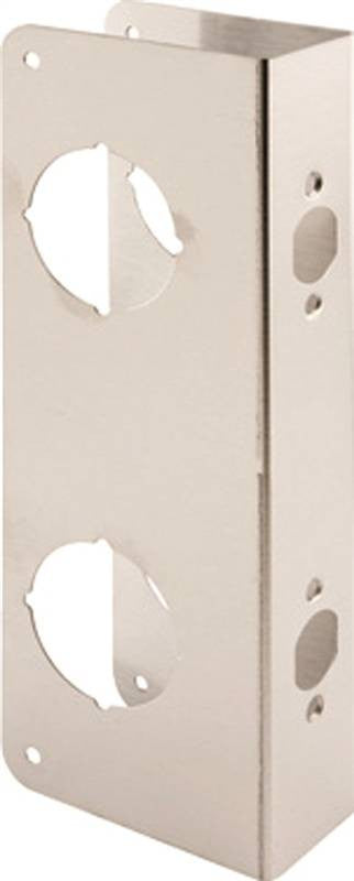 Reinforces and repairs door edge and assists in preventing forced entry. Used on wood or metal doors with mortise or drive-in latches. Accommodates key-in-knob locksets and deadbolts or combination locksets. Door thickness 1-3/4", bore 2-1/8", backset 2-3/8". Reinforcer: Non-recessed edge type, 3-7/8"W.